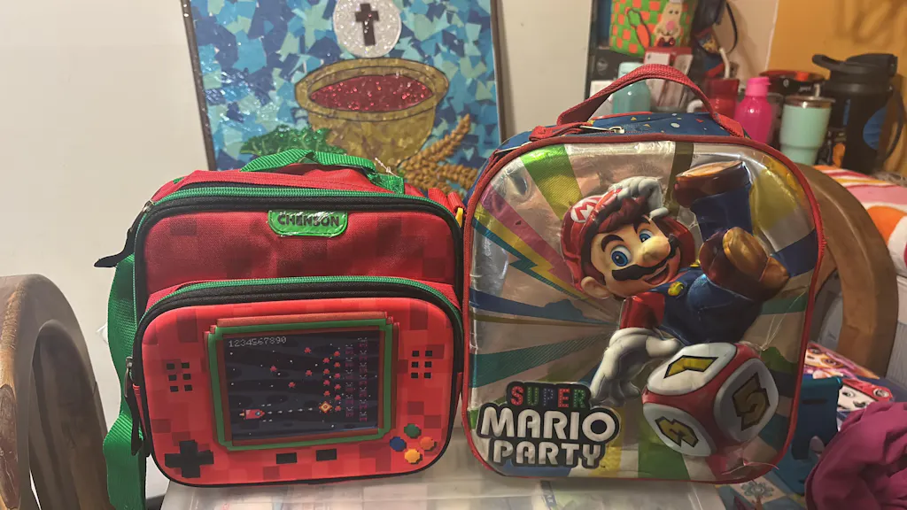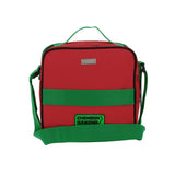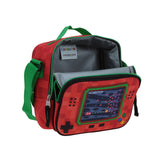 Lonchera Chenson Original en rojo con diseño sublimado de consola de videojuego. Su termoformado gráfico en 3D le da un toque único. Cuenta con un amplio compartimento principal con cierre, un bolsillo frontal, y un elástico interior para botella. La asa larga ajustable y el forro térmico mantienen la comida fresca. Además, la banda elástica trasera permite acoplarla a una mochila con ruedas.