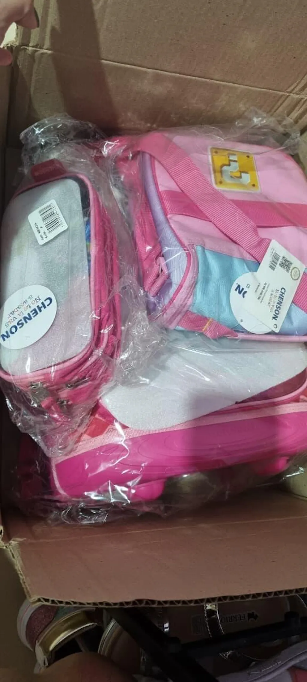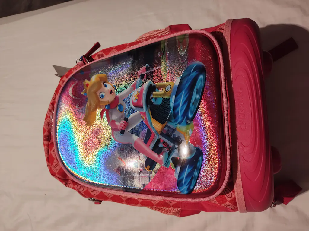 Todo llegó intacto, en buen estado, protegido. La mochila de rueditas , la lonchera y la lapicera de Peach están de muy buen tamaño, el material se ve resistente.